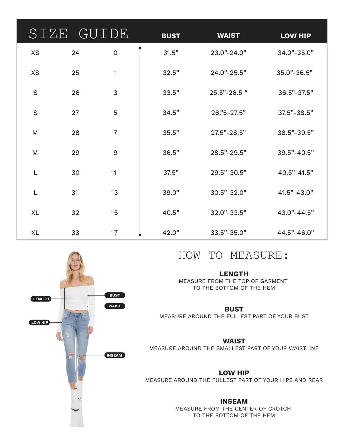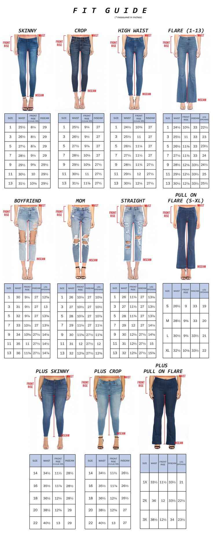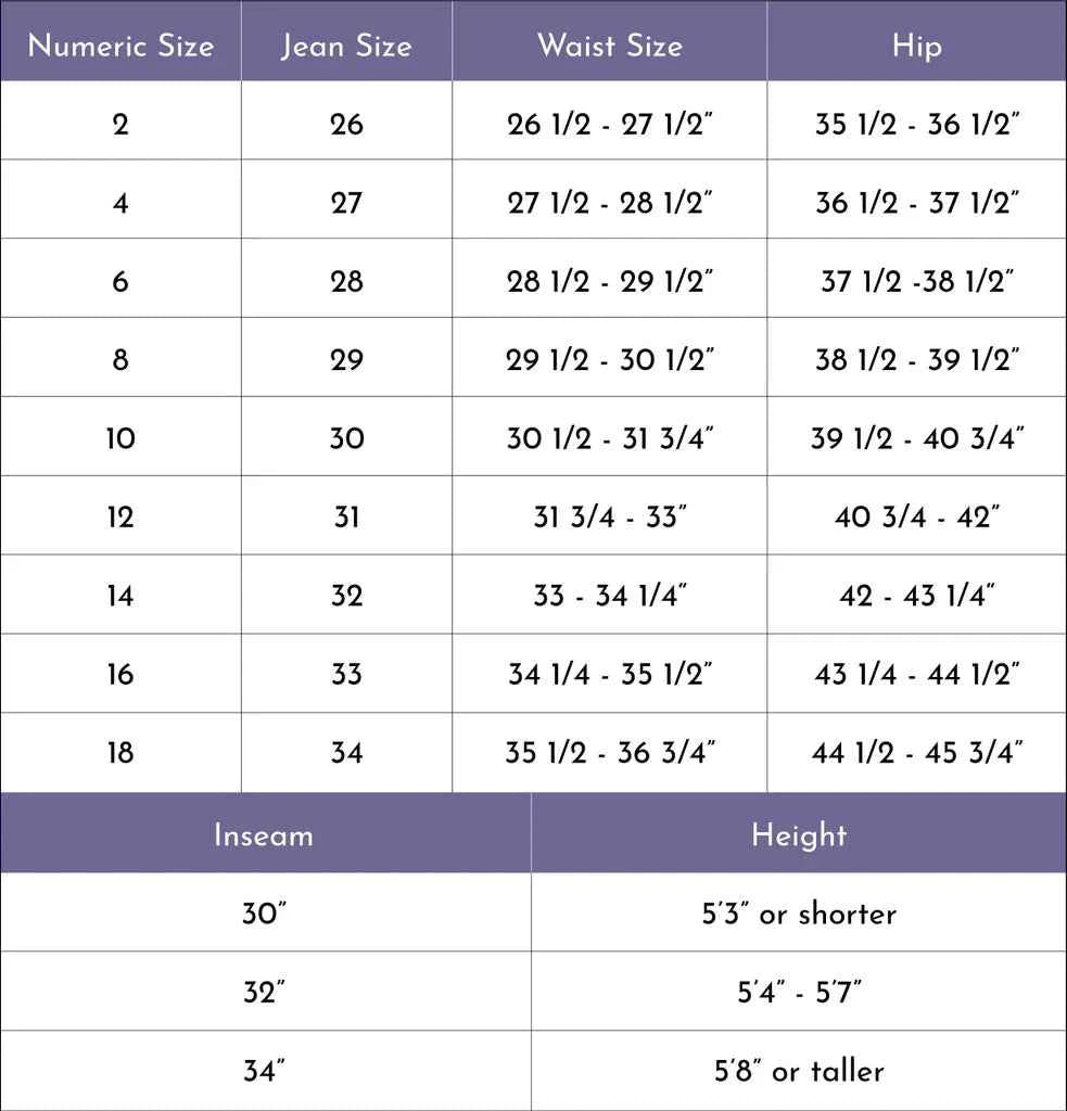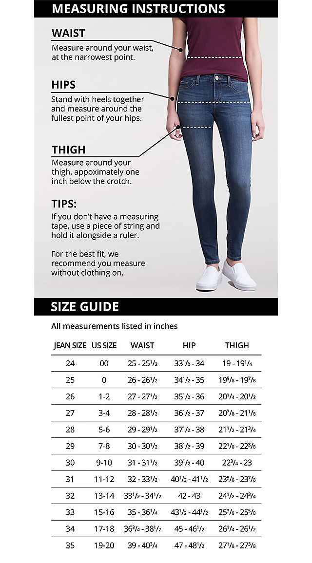 Our women's jeans sizing follows standard measurements: