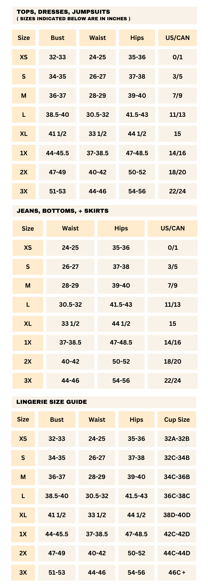 Remember, our goal is for you to love the fit of every piece you order. Don't hesitate to reach out if you need sizing assistance!