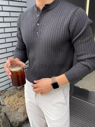 Button Detail Ribbed Long Sleeve Men's Knit Top