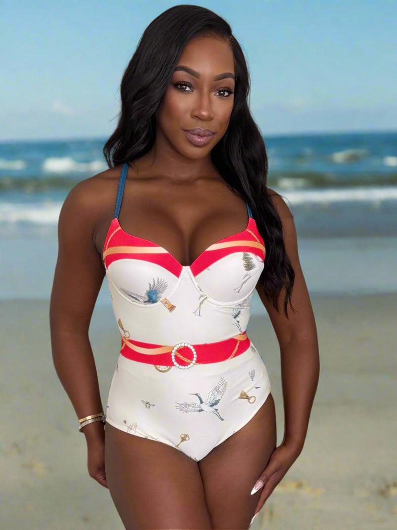 Refined and eye-catching, the Crane Key One-Piece Swimsuit blends elegance with standout design. Set against a soft cream backdrop, the suit features an artful crane and key print that evokes a sense of timeless sophistication. A coral red waistband with a pearl-accented ring defines the silhouette, while the structured bust and adjustable straps provide support and customizable comfort. Whether you're lounging poolside or layering it under the matching kimono, this one-piece delivers elevated resort style with ease.