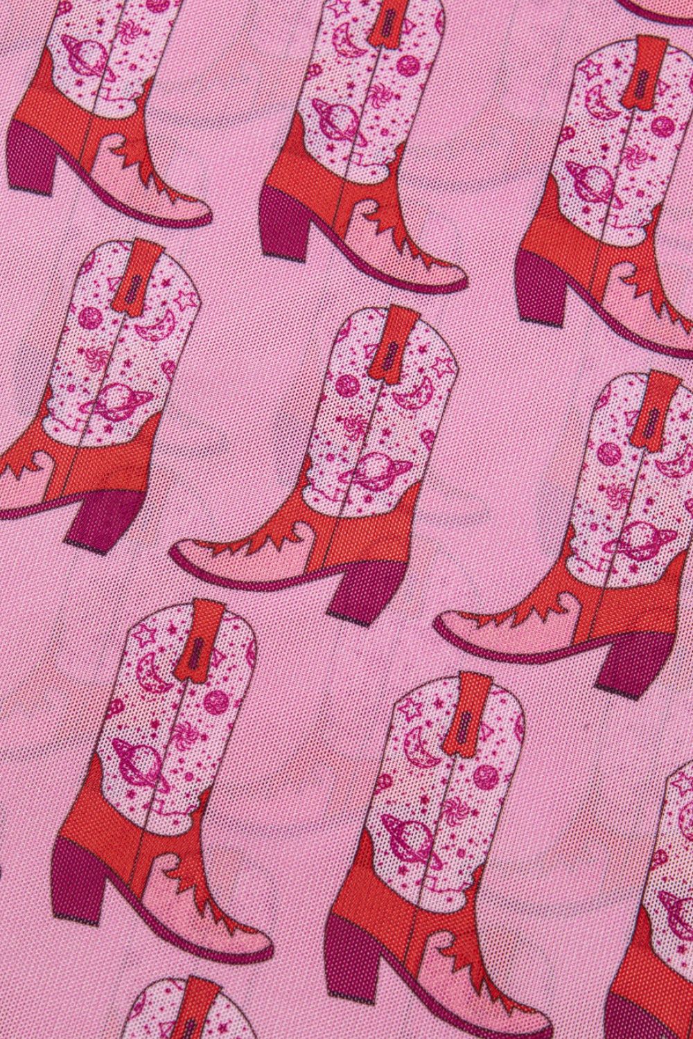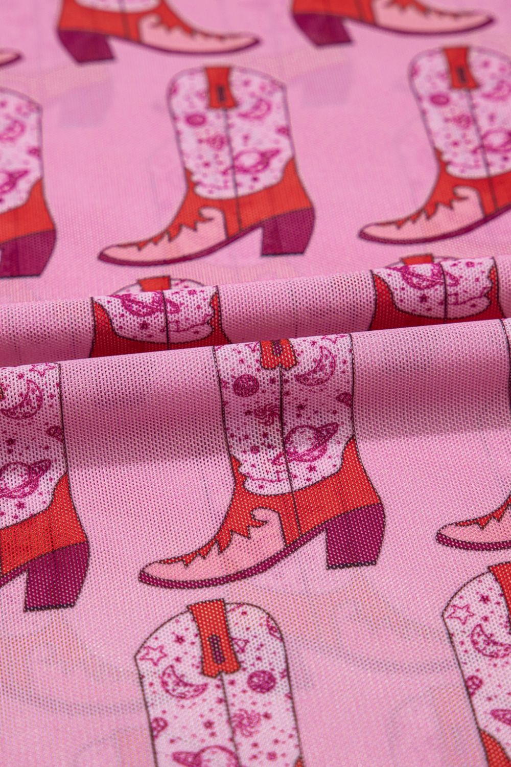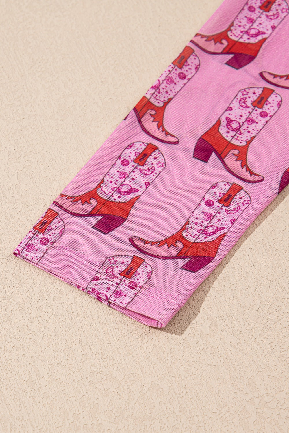 Cowgirl Boots Printed Mock Neck Long Sleeve Mesh Top