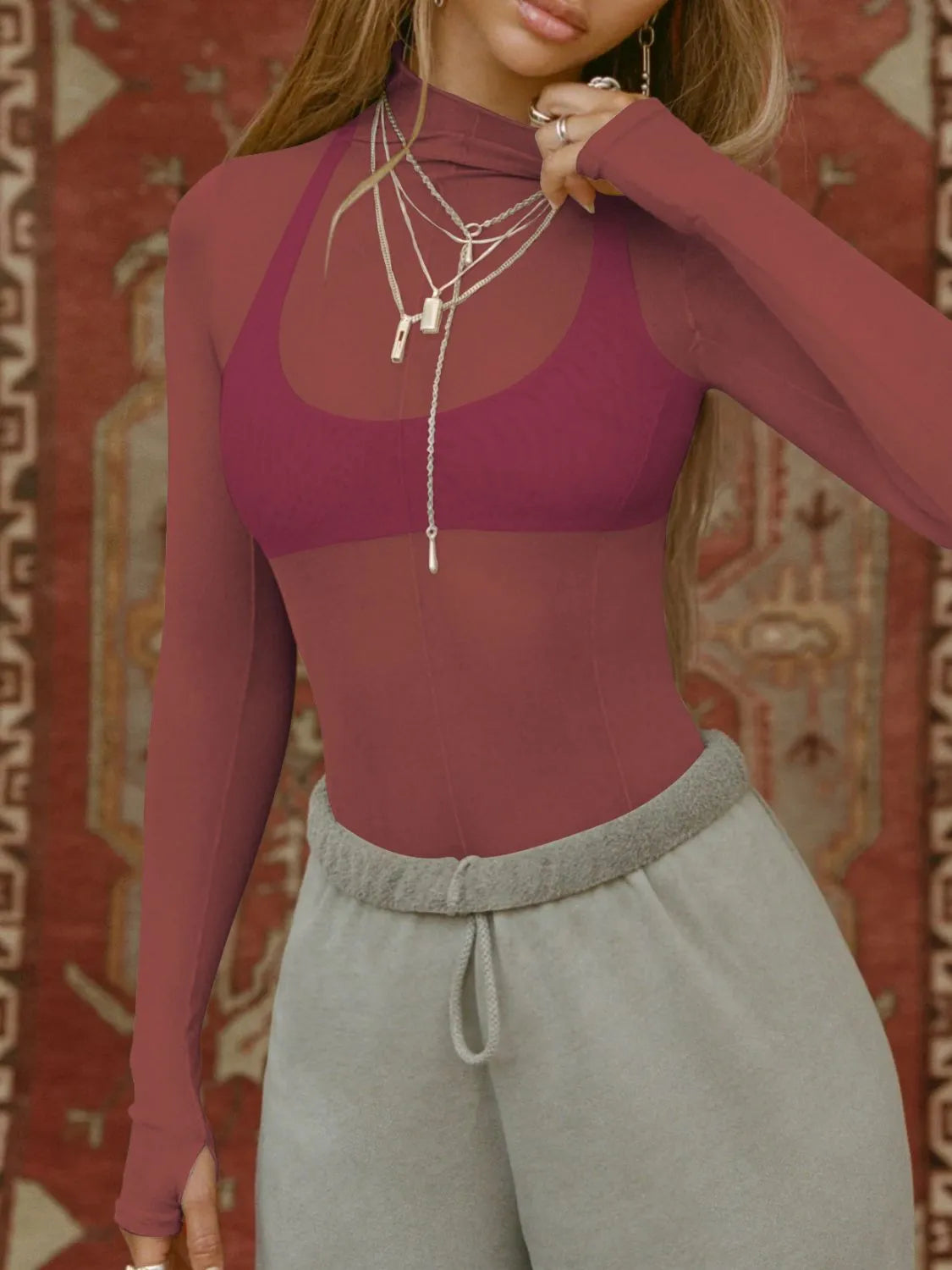 Mock Neck Long Sleeve Sheer Top