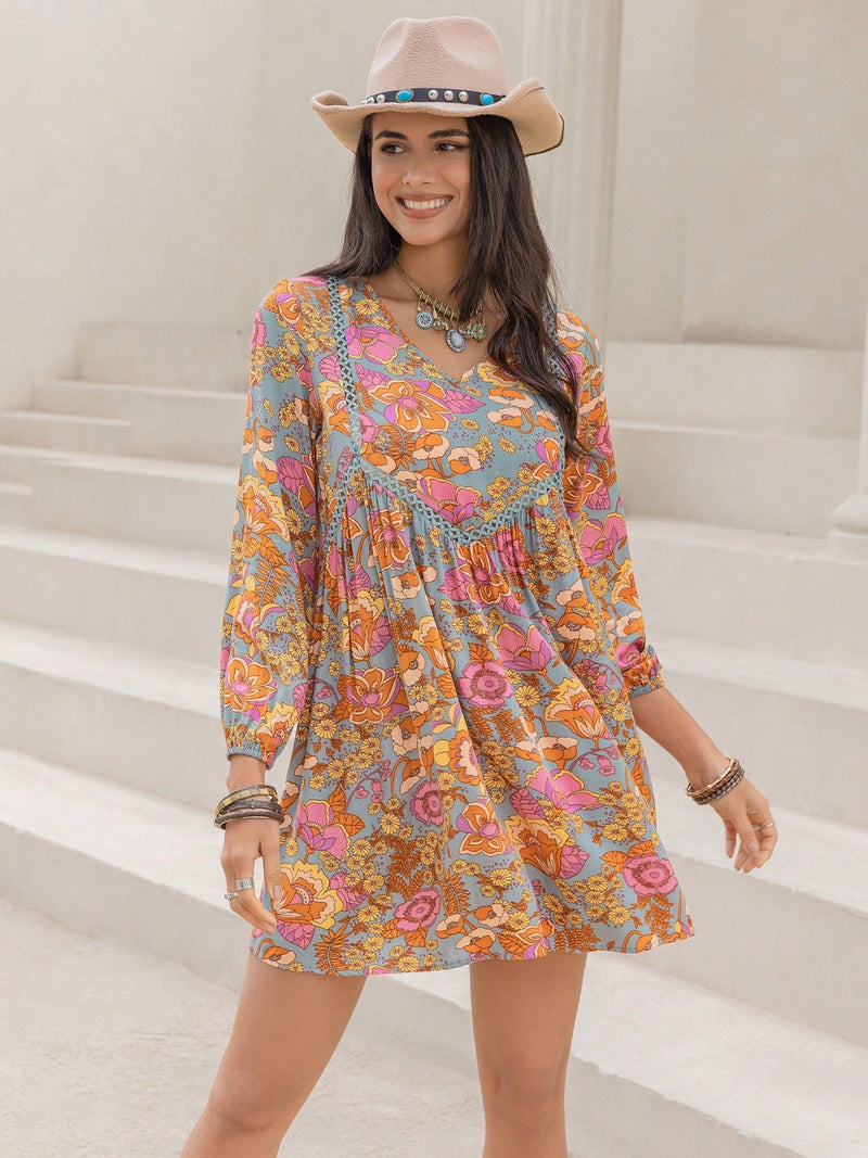 🌼 Printed V-Neck Balloon Sleeve Mini Dress – Comfort Meets Style!