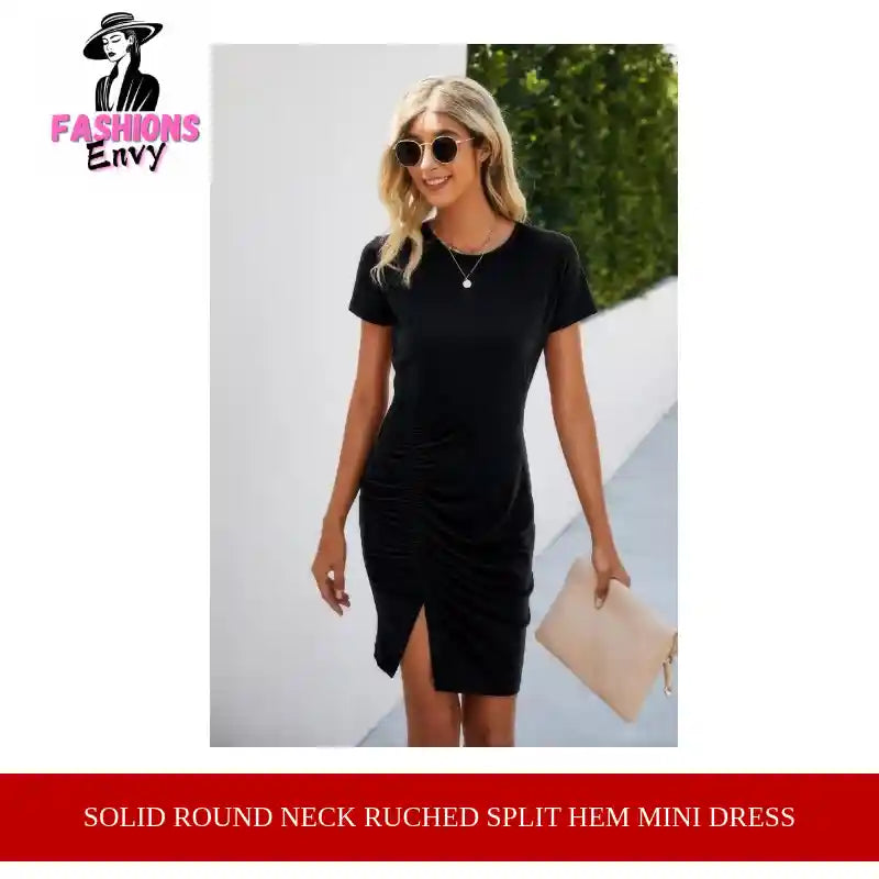 Chic and streamlined, this solid ruched dress is designed to flatter with its subtle detailing and modern silhouette. Featuring a classic round neckline and side ruching, it enhances your shape while maintaining a polished look. The split hem adds just the right touch of movement and edge, making it perfect for everything from casual outings to weekend getaways. Crafted from 100% polyester, this dress is lightweight, breathable, and easy to wear all day long. Simple yet stylish, it's a versatile piece you'll reach for again and again.