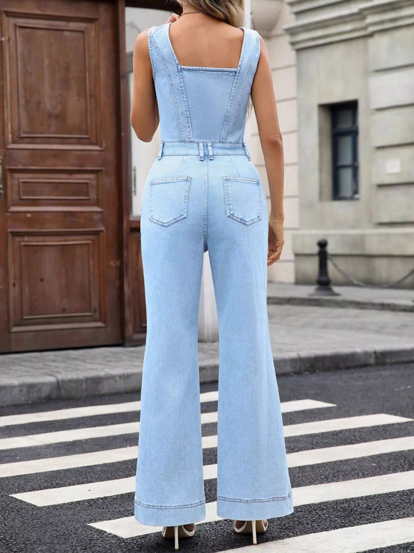 Wide Leg Sleeveless Denim Jumpsuit with Button Front